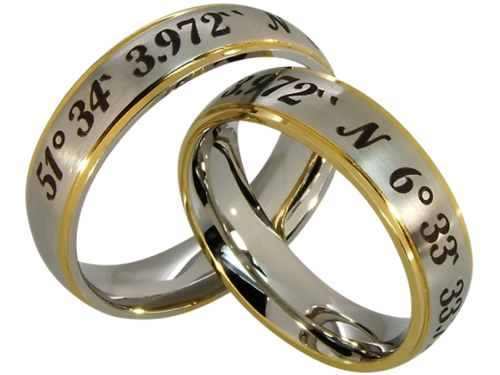 Die Ringe sind mit einer Laseraußengravur ("die von Ihnen ermittelten Koordinaten") veredelt. Die Schriftart ist nicht veränderbar.